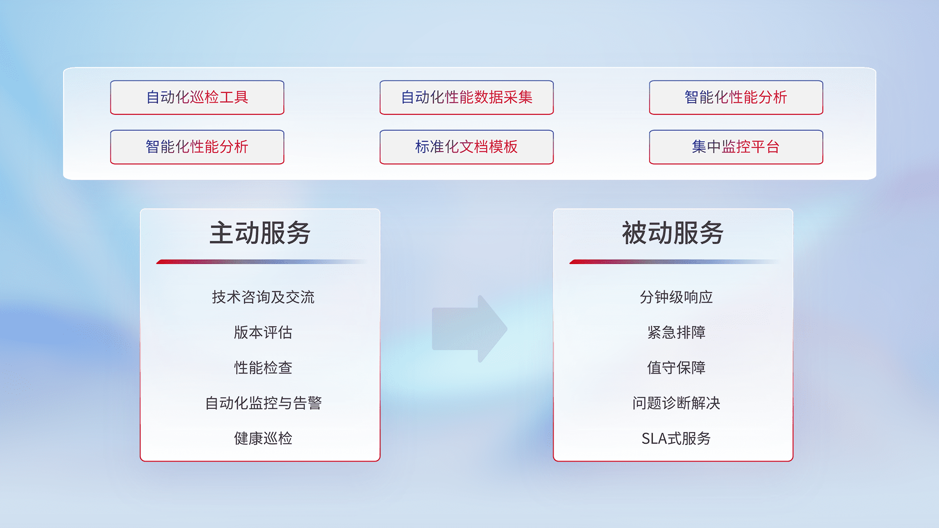智能化工具和标准化文档,,,保障服务质量,,,提供主动服务(包含技术咨询、、版本评估、、、、性能检查、、自动化监控与告警、、、、健康巡检)和被动服务包含(分钟级响应、、、紧急排障、、、值守保障、、、、问题诊断解决、、、、SLA服务)。。。